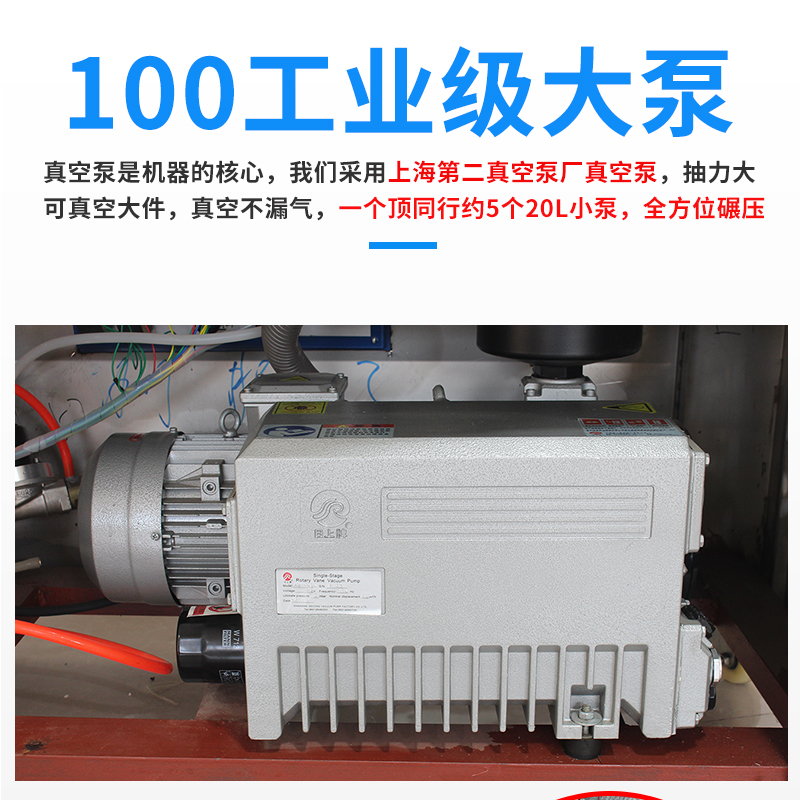 該機(jī)采用國(guó)內(nèi)知名品牌上海第二真空泵產(chǎn)生產(chǎn)的工業(yè)級(jí)大泵,引起德國(guó)普旭技術(shù),部分核心部件為全進(jìn)口,關(guān)鍵部位材質(zhì)含有微量金屬元素,真空泵壽命更持久,其中真空油為專業(yè)配方,耐高溫,比傳統(tǒng)真空泵油更耐用。抽氣速率為100m3/H,